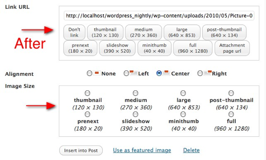 It adds image sizes to the Upload/Insert image screen, adding image sizes to be inserted and adding to the image link field options.